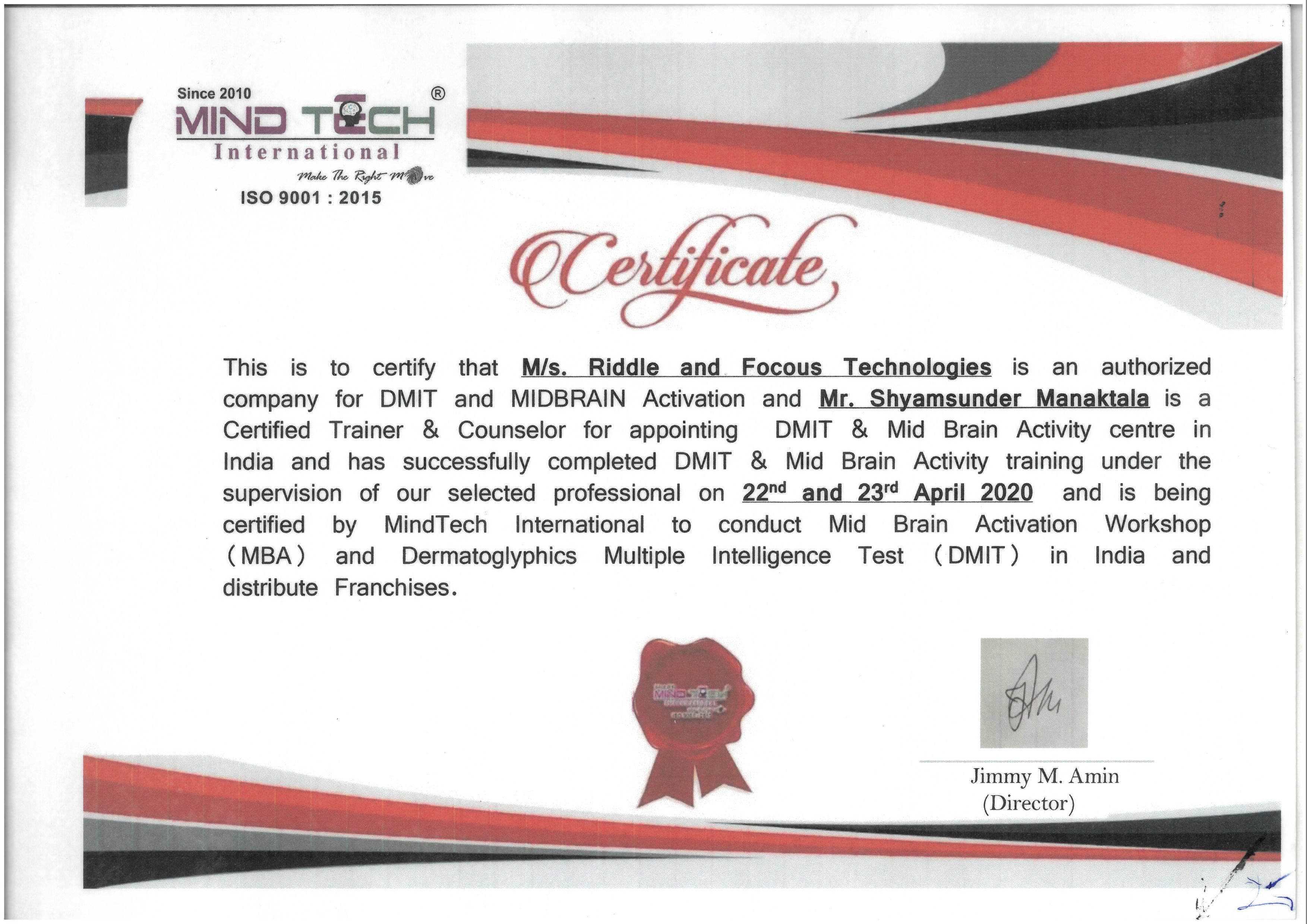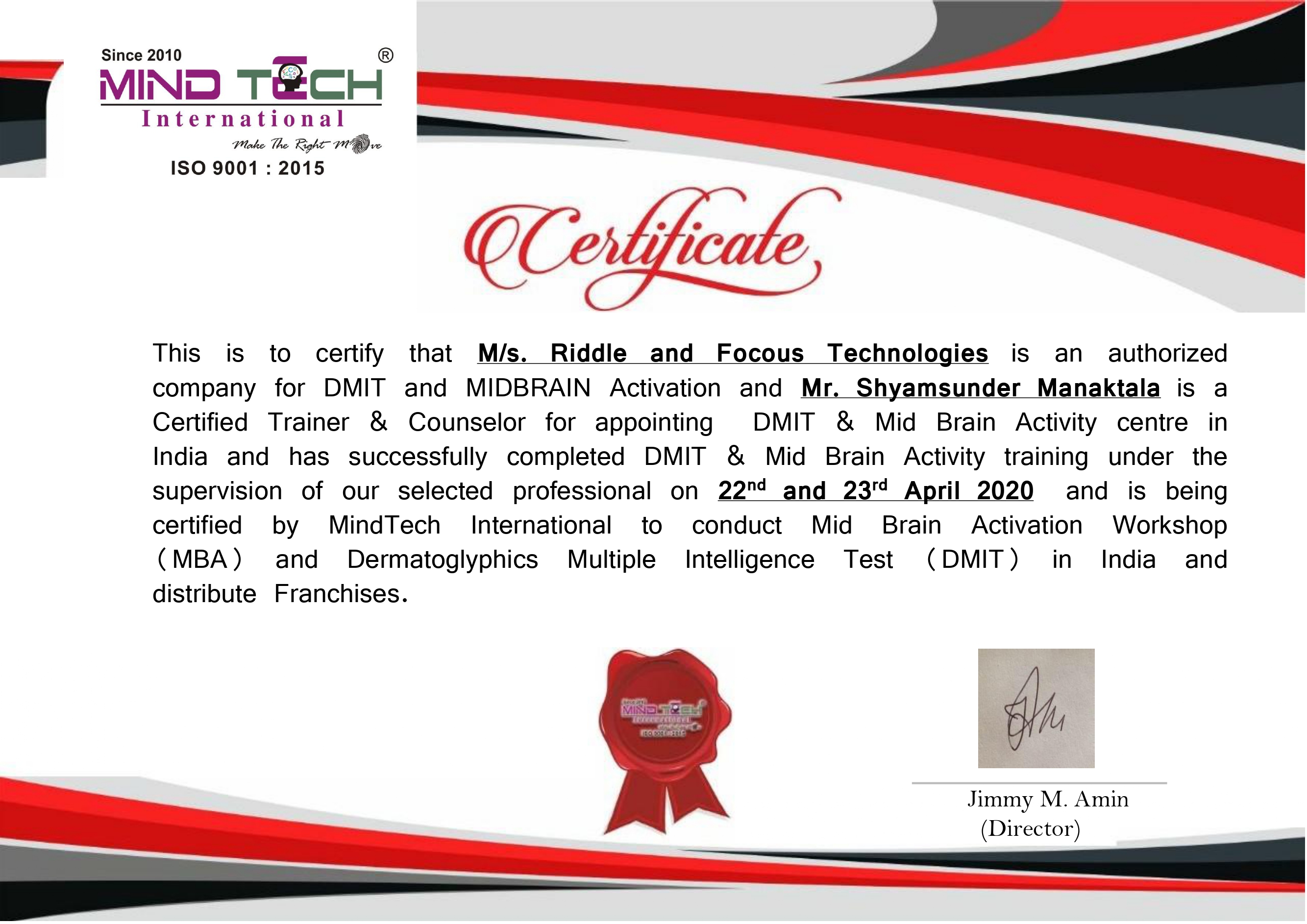 Certified Trainer & Counsler for appointing DMIT & Mid braain Activity Centre